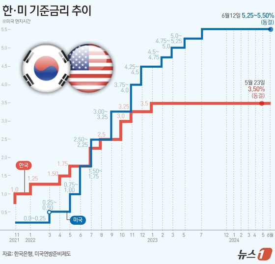 6월 FOMC에서 위원들은 만장일치로 미국의 현행 금리(5.25%~5.50%)를 유지하기로 결정하고, 인플레이션 억제를 위해 아직 높은 수준의 금리가 필요하다고 설명하였습니다. 파월 의장은 인플레이션이 이전에 비해 개선되고 있으나 목표(연율 2%)를 향해 나아가고 있다는 확신을 갖기 위해서 추가 정보가 필요하다고 발언하였으며 노동시장은 강하지만 점차 냉각되고 있다고 진단하고 이날 발표된 5월 소비자물가 결과는 고무적이었으나 지금 당장 금리인하 필요성을 나타낼 정도는 아니라고 언급하였습니다. 경제전망요약(SEP)에 따르면, 연준은 금년 인플레이션(근원 PCE) 전망을 소폭 상향(2.6%→2.8%)했고, 경제 성장률과 실업률 전망은 기존 수준을 유지(각각 2.1%→2.1%, 4.0%→4.0%)를 전망하였는데요. 시장에서는 점도표의 금년 금리인하 전망 횟수가 줄었으나 인플레이션 둔화 진전 등 일부 비둘기파적(dovish) 내용이 포함되어 있다고 평가하였으며 한편, CME의 FedWatch Tool은 금년 2회(9월과 12월. 각 0.25%p)의 금리인하를 예상하였습니다.
